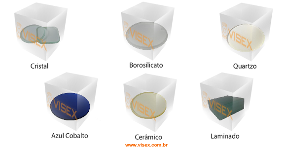 Vidros circulares, retangulares ou oblongos são planos e transparentes, com bordas lapidadas e chanfradas e com área de vedação e visão retificada e polida. Possibilitam excelente visualização do ambiente interno dos equipamentos.