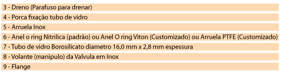 O indicador de nível de inox 316 foi desenvolvido para atender a necessidade de um visor para reservatórios e caldeiras com baixa pressão (até 20 Bar). Sua construção possibilita a troca do tubo de vidro sem parada do equipamento. Composto por uma válvula superior, uma inferior e um dreno, o que facilita a manutenção. O mesmo pode ser fornecido com canaleta de proteção, na qual a mesma é encaixada, podendo ser regulada em 360 graus, mesmo com o equipamento em funcionamento. A proteção é vendida à parte e dispensa o uso de abraçadeiras e parafusos.