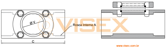 O visor de fluxo com conexão rosca, é vendido como padrão com janela simples. O visor de fluxo conexão rosca tem como função facilitar a visualização interna da tubulação. Devido ao seu tamanho e peso, também como opcional pode ser utilizado em mangueiras para visualização do fluído (montado com conexção para mangueira).